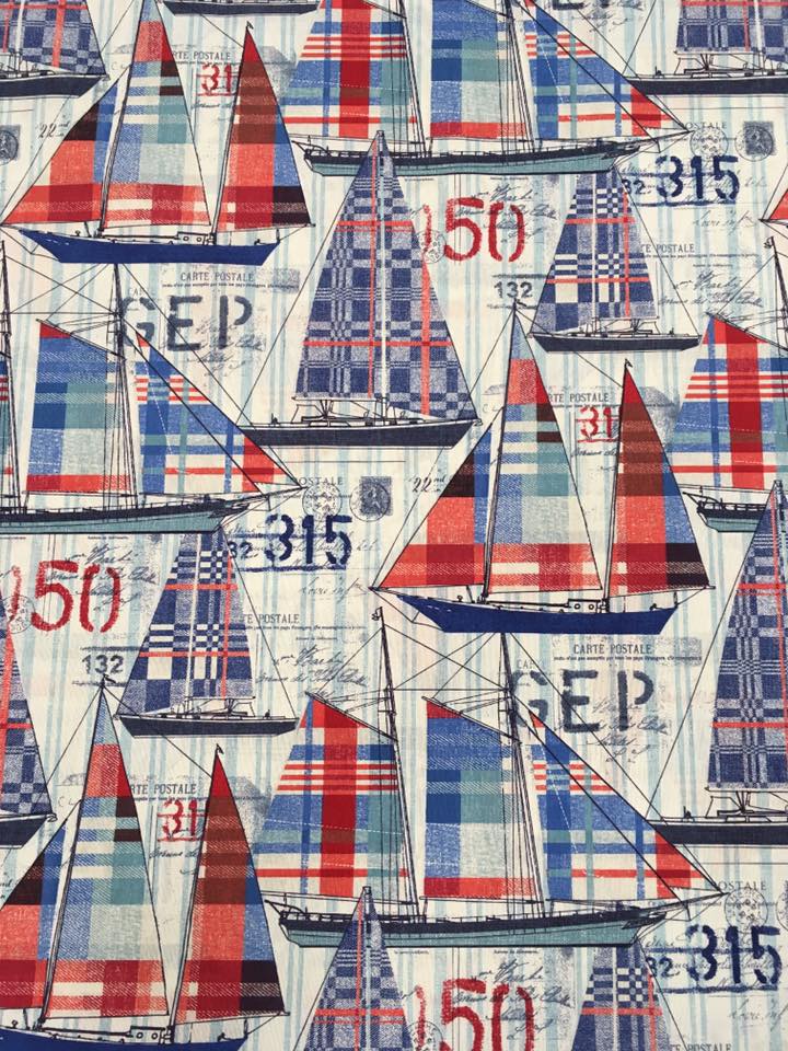 Плат "Платноходи сини" с ширина 280см. Цена за л./м. : 15лв. Състав: 70% памук, 30% полиестер. Минимално количество при поръчка онлайн: 1л./м. Поръчките се доставят в рамките на три работни дни с куриерска фирма Еконт. Цена за доставка с Еконт около 6лв.